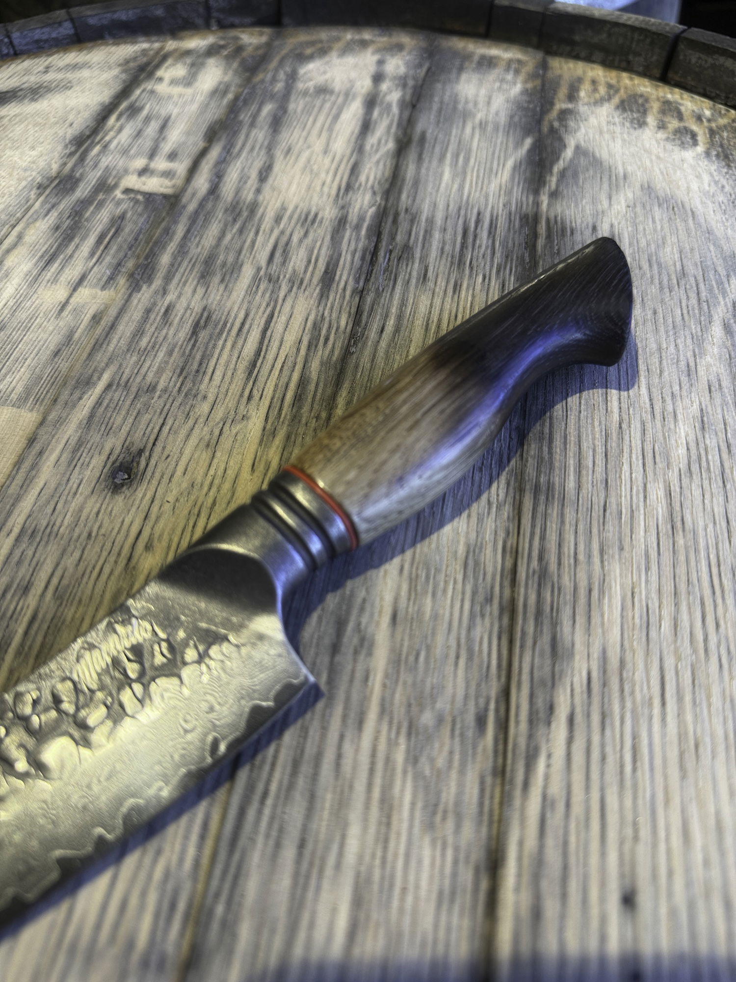 Der ergonomisch geformte Griff aus edlem Holz liegt angenehm in der Hand und bietet sicheren Halt auch bei längeren Arbeiten. Der harmonische Farbverlauf des Holzes unterstreicht die Einzigartigkeit jedes einzelnen Messers – jedes Stück ist ein Unikat.