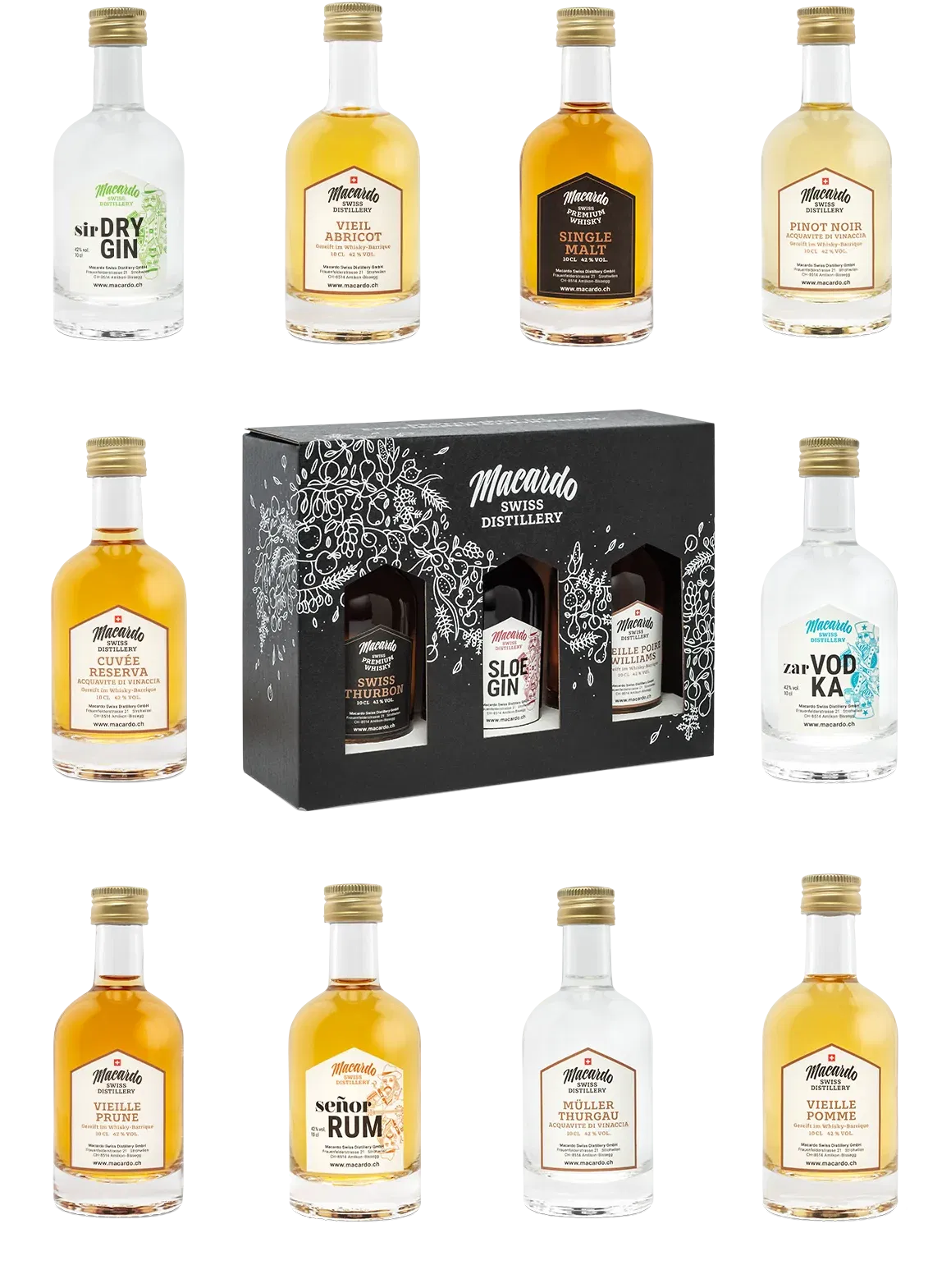 Mit dem praktischen Macardo Degustations Box Konfigurator stellen Sie sich Ihre persönliche Schachtel online selbst zusammen. Zur Auswahl stehen 14 edle Spirituosen in stilvollen 10cl-Fläschchen – darunter: