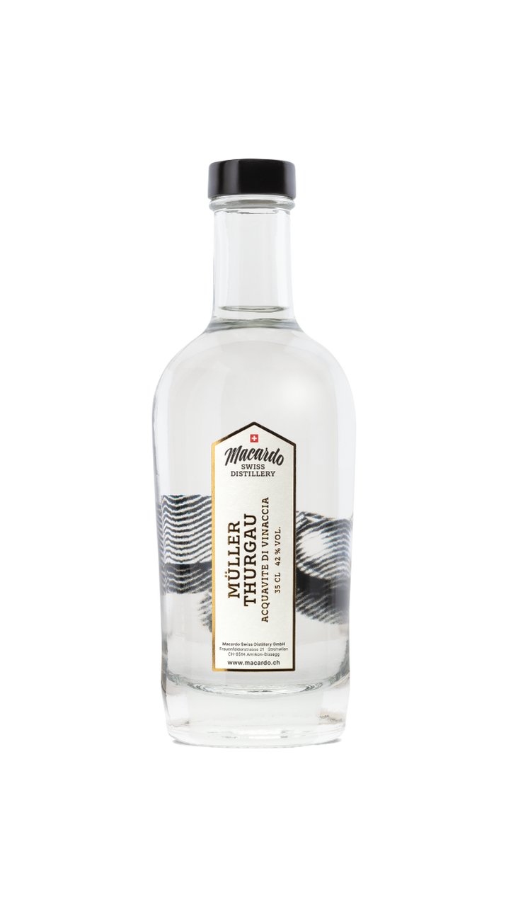 Der Schweizer «Aquavite di vinaccia» Müller-Thurgau wird aus sortenreinem Müller-Thurgau-Traubentrester aus Schweizer Produktion in kleinen Chargen hergestellt. Er überzeugt mit kristallklarer Reinheit, dem unverfälschten Aroma von Müller-Thurgau-Trauben und ist ausserdem am Gaumen vielschichtig und mild. Er ist herrlich blumig, würzig, zudem fruchtig, frisch und bemerkenswert zart. Ein Tresterbrand aus der Schweiz, der als «Aquavite di vinaccia» höchste Schweizer Brennkunst verkörpert. Er zählt zu den besten sortenreinen «Grappa-Alternativen» aus Schweizer Produktion.