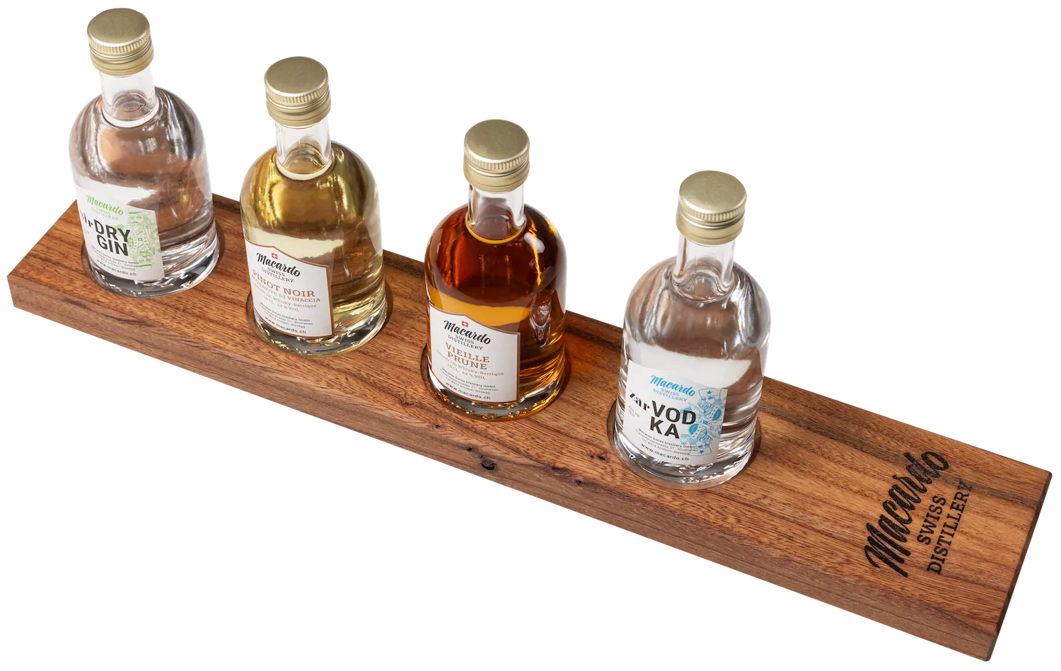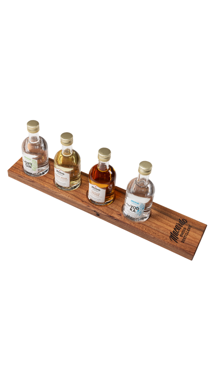 Ein fantastisches Geschenk für alle, die Spirituosen und Verkostungen lieben. Mit dem Ulmenholz Degustationsbrett und den 16 verschiedenen 10cl Destillaten aus denen man auswählen kann, findet man sicherlich das passende Destillate für einen Geniesser oder für sich selber. Benutzen Sie den Macardo-Konfigurator um Ihre eigene Auswahl zu treffen.