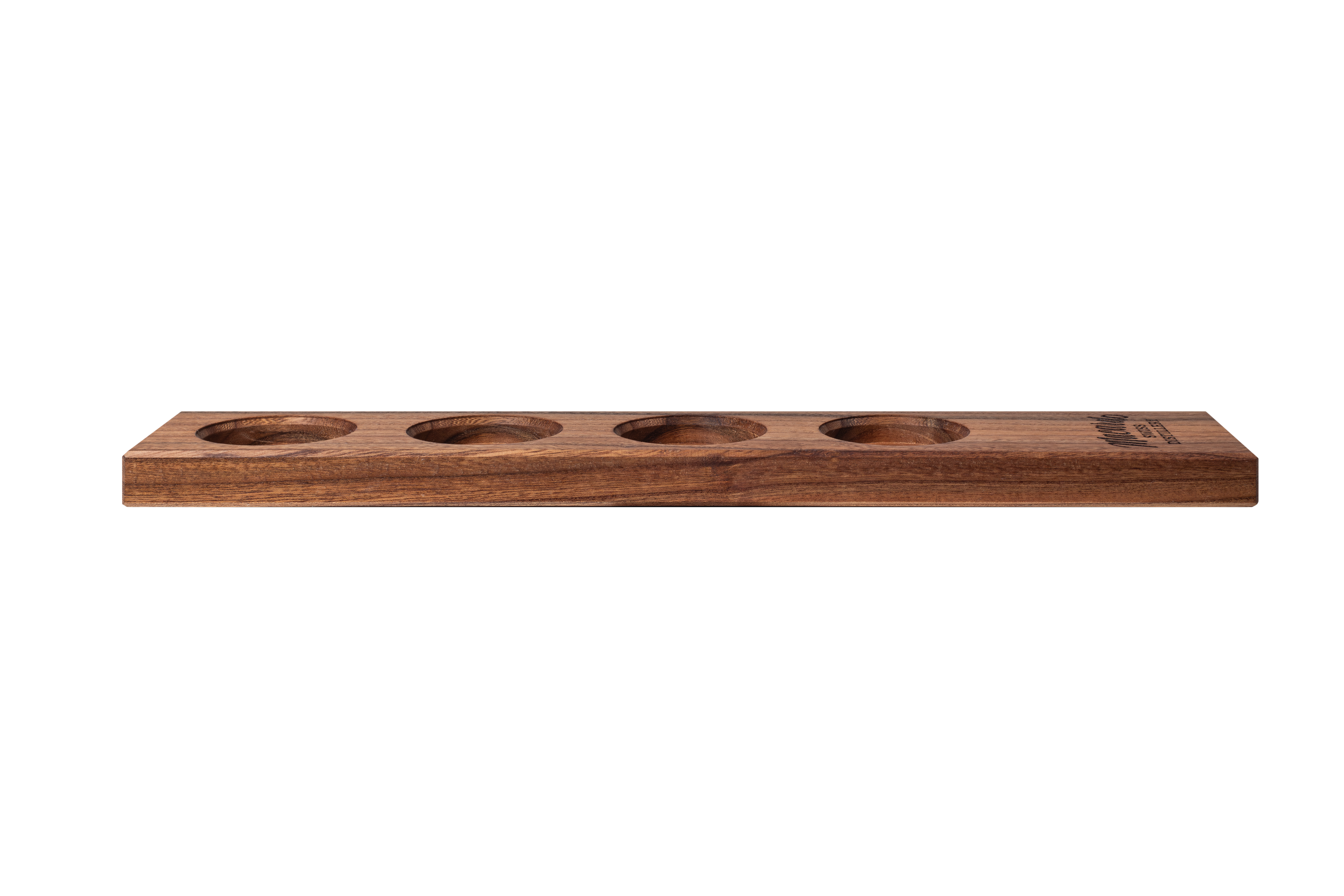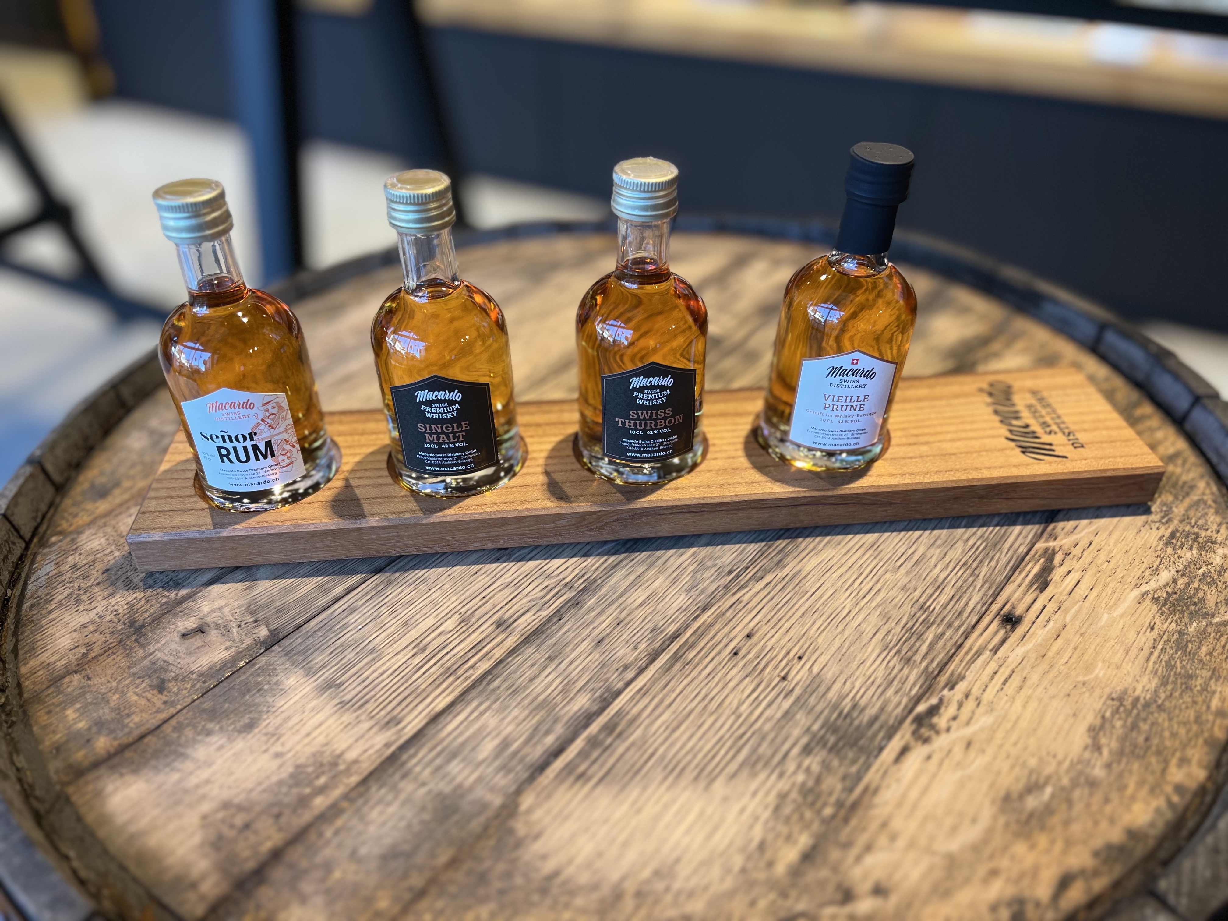 Das Ulmenholzbrett zum selber befüllen mit 4 verschiedenen Flaschen oder Gläsern - Unzählige Möglichkeiten Macardo zu geniessen