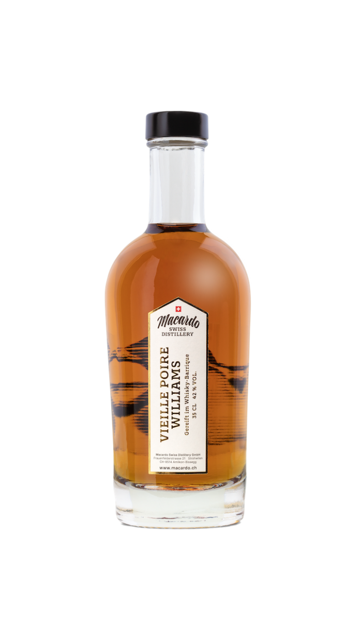 Nach einem alten Schweizer Rezept hergestellt, reift dieser Fruchtbrand lange in Whiskyfässern, ergänzt durch gedörrte Williamsbirnen. Die leichten Holz- und Whiskyaromen verleihen ihm eine exklusive Würze, ohne den charakteristischen Birnengeschmack zu überdecken. Ein absoluter Hochgenuss für Liebhaber feinster Destillate.