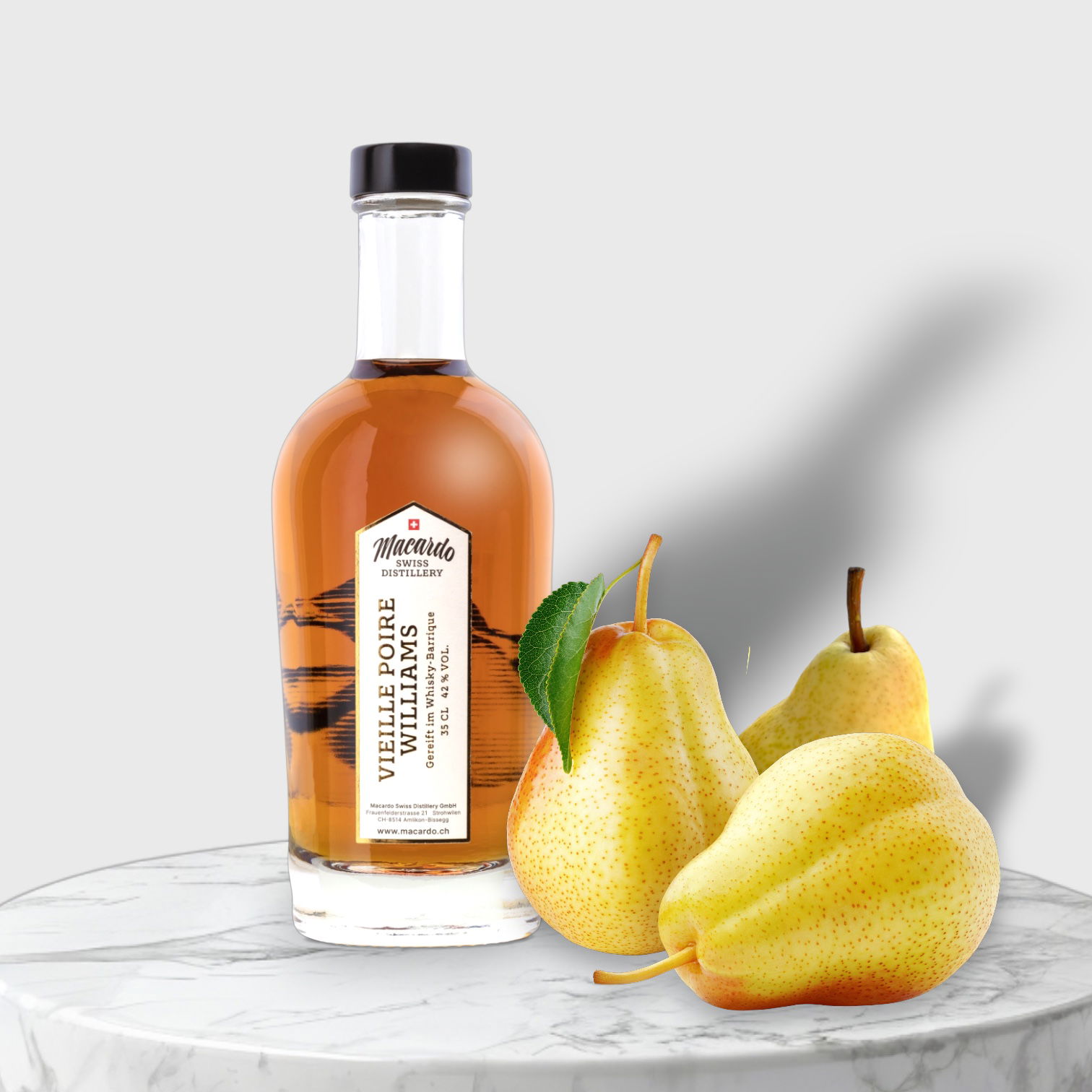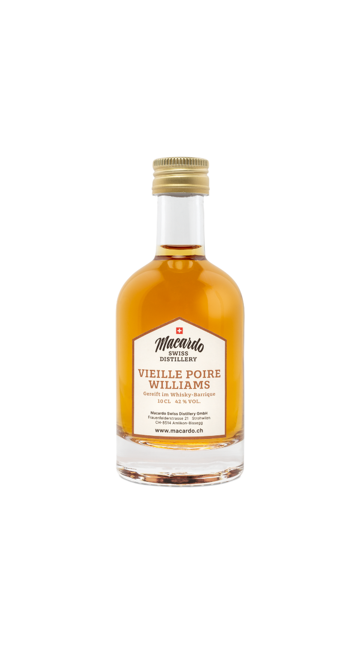 Nach einem alten Schweizer Rezept hergestellt, reift dieser Fruchtbrand lange in Whiskyfässern, ergänzt durch gedörrte Williamsbirnen. Die leichten Holz- und Whiskyaromen verleihen ihm eine exklusive Würze, ohne den charakteristischen Birnengeschmack zu überdecken. Ein absoluter Hochgenuss für Liebhaber feinster Destillate.